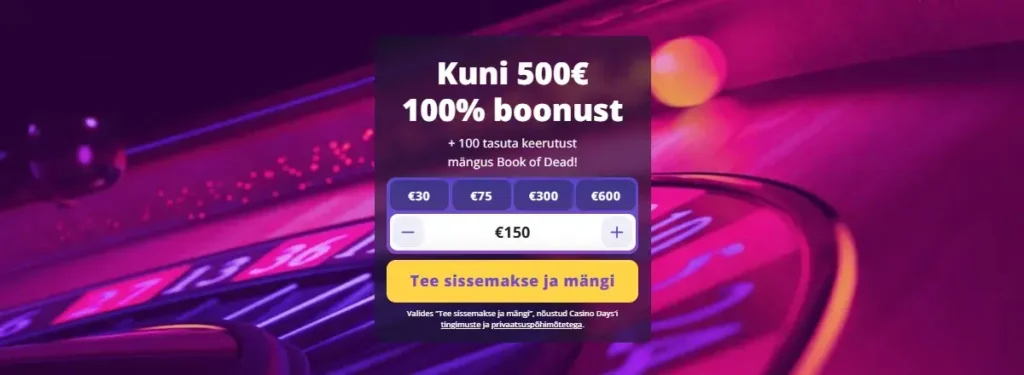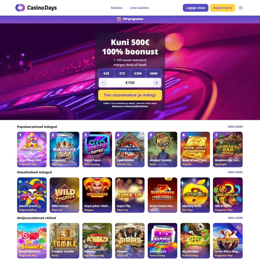 7kasiino.ee hinnang: CasinoDays on Eestis litsentseeritud ja mänguvalikult üks terviklikumaid kasiinosid, mis sobib mängijale, kes hindab suurt slotivalikut, tugevat live-kasiinot ja korralikke väljamakselimiite. Tervituspakett on sirgjooneline (100% kuni 500 € + 100 FS), läbimängimine on turustandard 35x, ning reeglid on läbipaistvalt kirjas. Boonustingimused on siiski rangemad mõnes punktis (max panus, keelatud mängude loetelu, e-rahakottide välistus boonusele), mistõttu soovitame boonuse lehe enne aktiveerimist alati üle lugeda.