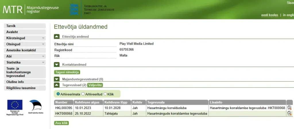 - Eesti litsentsid: Kaughasartmängu korraldusluba HKL000395 ja õnnemängu tegevusluba HKT000068 (järelevalve: Eesti Maksu- ja Tolliamet).