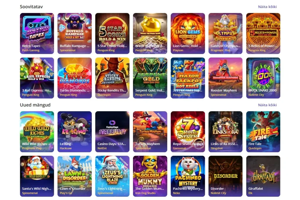 - Slotid & jackpotid: NetEnt, Play’n GO, Pragmatic Play, Quickspin, Red Tiger, Nolimit City, Hacksaw, Relax, Thunderkick, ELK, BTG, Blueprint, Push Gaming, Wazdan, Playson, Spinomenal, GameArt jpt. Kategooriad: Uued mängud, Populaarsed, Jackpot Games, Drops & Wins, Megaways, Boonusostu slotid, kobarvõidud, Win Both Ways, teemakategooriad (Rooma/Egiptus, klassikalised, muinasjutud jne).