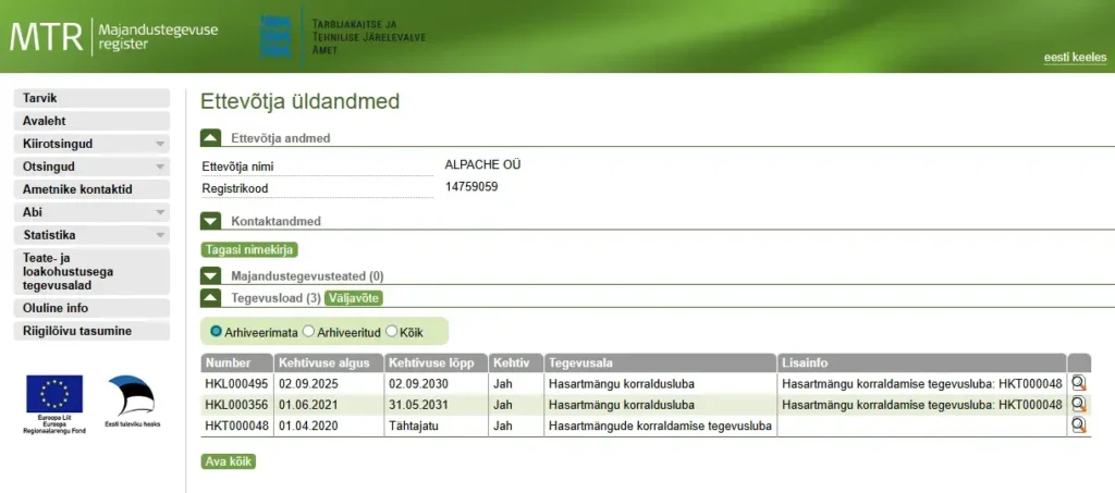 - EMTA load: dokumentatsioonis viidatakse HKT000048 (hasartmängude tegevusluba) ja HKL000334 / HKL000495 (operatsiooniload—viited on lehtedel ebajärjepidevad).